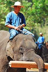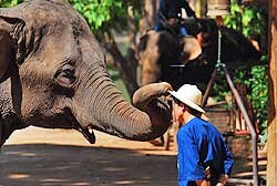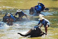The Elephant Conservation Centre in Lampang offers various activities for visiting tourists. Everyday at 9:45am, visitors gather by a pond to watch elephants bathe when kids can be spotted eying the pachyderm with a sense of awe and excitement as the huge animals disappear under water and resurface. After the wash the elephants are ready for the show. They line up holding the tail of the one before them with their trunk. The two big ones in the front hold drums and the thrid one performed as a drummer. The sounding of the drums is a signal for the kids to head for the open-air auditorium. The show brings back to life the utility of elephants in the old days when they were used to haul logs from the forests in northern Thailand rich in teak and other trees. Since the government slapped a ban on logging, these elephants are now virtually out of work. But here at the centre, their skills are not forgotten; in fact they are still very much appreciated and along the way have been taught a few new skills that are used to entertain visitors. The centre is a training ground for elephants. Here you can see the animal moving logs with their powerful trunk and tusks. You will be amazed to see the huge beasts walk forward and back on a log and even make and an about turn. There is a moderator who keeps the show lively with some witty commentary. According to the moderator, the animals were still perfect for terrain not accessible by car or other mechanised transport, and they didn't need refuelling because there was plenty of food for them in the jungle. These animals, visitors will learn, can also operate together as a team, but only if relations between team members are cordial. We saw two elephants hauling a huge piece of log and the moderator underscored the point saying that elephants were just like humans who wouldn't want to work with somebody they didn't get along with. One of the new skills elephants have been taught is painting. They have their own individual styles and their paintings go for 500 baht each or more. Other skills can be variously described as playing musical instruments, running errands for mahouts or turning on the water tap when feeling thirsty. But the moderator reminded his audience that elephants at the centre weren't treated like those we see in circus, like standing on hind legs. That, the moderator explained, could do harm to the animal, given its huge weight. For visiting tourists, homestay is another interesting choice where they can learn how to communicate with elephants or how to command and control them in the most basic way. A three-day package including mahout training and cooking classes is popular among tourists, although very few Thais subscribe to it, lamented a staff at the centre. That's understandable because price of the package last year doubled to 8,000 baht. I myself was thinking about enrolling for a six-day homestay package but had to immediately give up when told that it would set me back another 20,000 baht. A more leisurely option is watching elephants going about their chores from the comfort of a bungalow. Chang Thai Resort operates two- and three-bedroom bungalows priced 1,000 and 1,500 baht per night respectively.
